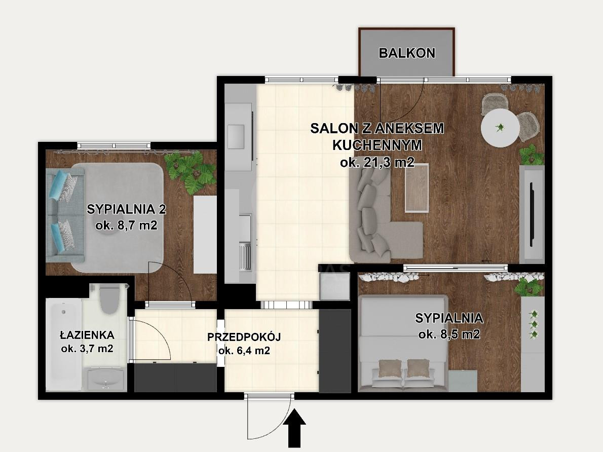 - salonu połączonego z kuchnią ok. 21,3 m2 z wyjściem na balkon ok. 2 m2