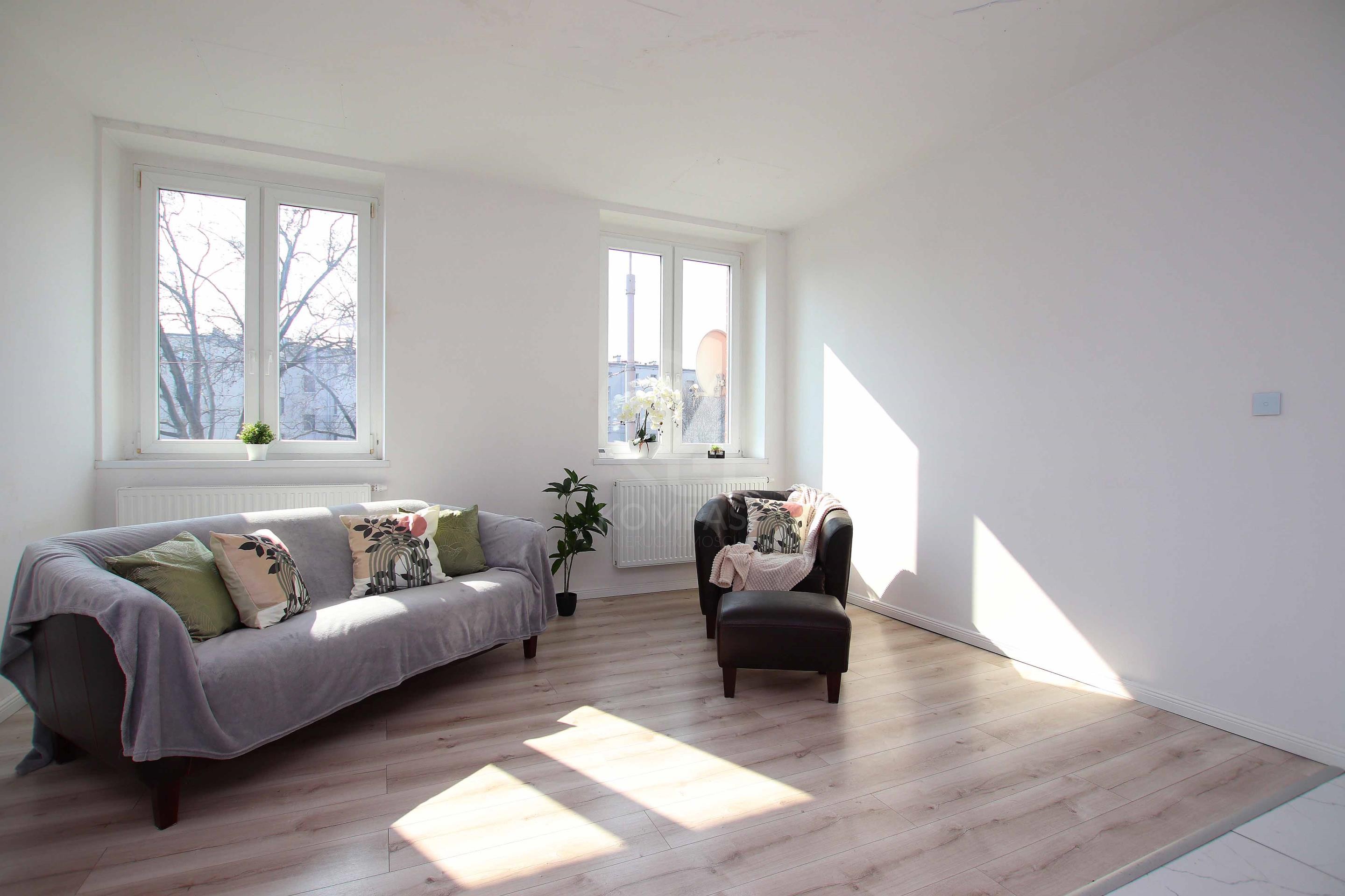 Mieszkanie przeszło w 2021 roku remont generalny. Wymiana wszystkich instalacji wraz z elektryczną. Ogrzewanie gazowe. Mieszkanie ma wysokie sufity ok 2,8 m. Duży i jasny salon. Kuchnia wyposażona w sprzęty AGD dobrej jakości (płyta gazowa Amica, zmywarka 60 Amica, piekarnik Amica, mikrofalówka Amica, lodówka). Na podłogach kafle oraz w pokojach panele. W łazience wanna oraz pralka. W mieszkaniu duże (3- szybowe) okna PCV, dzięki którym mieszkanie jest słoneczne i ciche. Lokal w stanie gotowym do zamieszkania ewentualnie do odświeżenia i do własnego doposażenia.